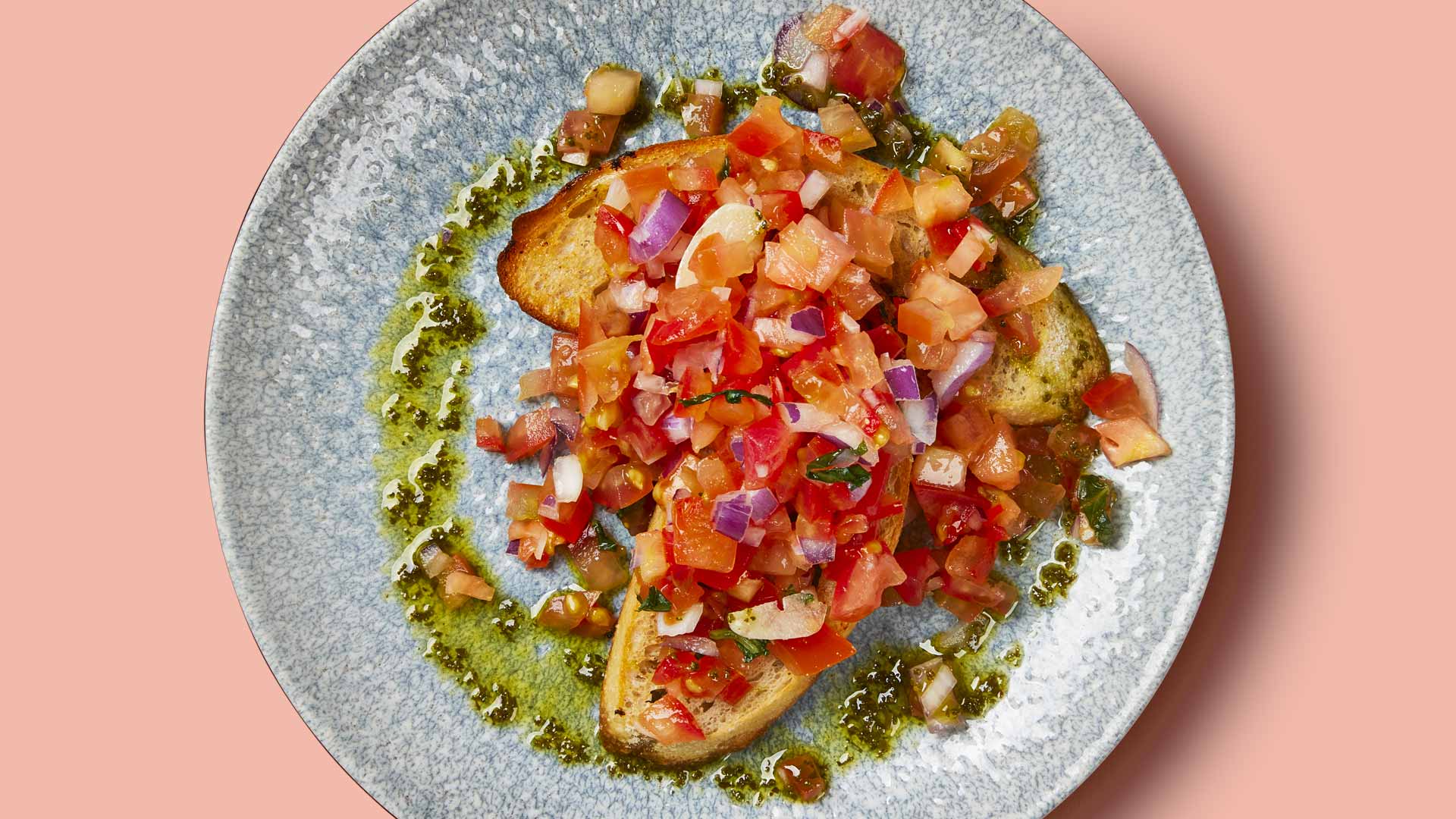 Lightly toasted garlic ciabatta slices topped with plum tomatoes, red onion, fresh basil and basil oil